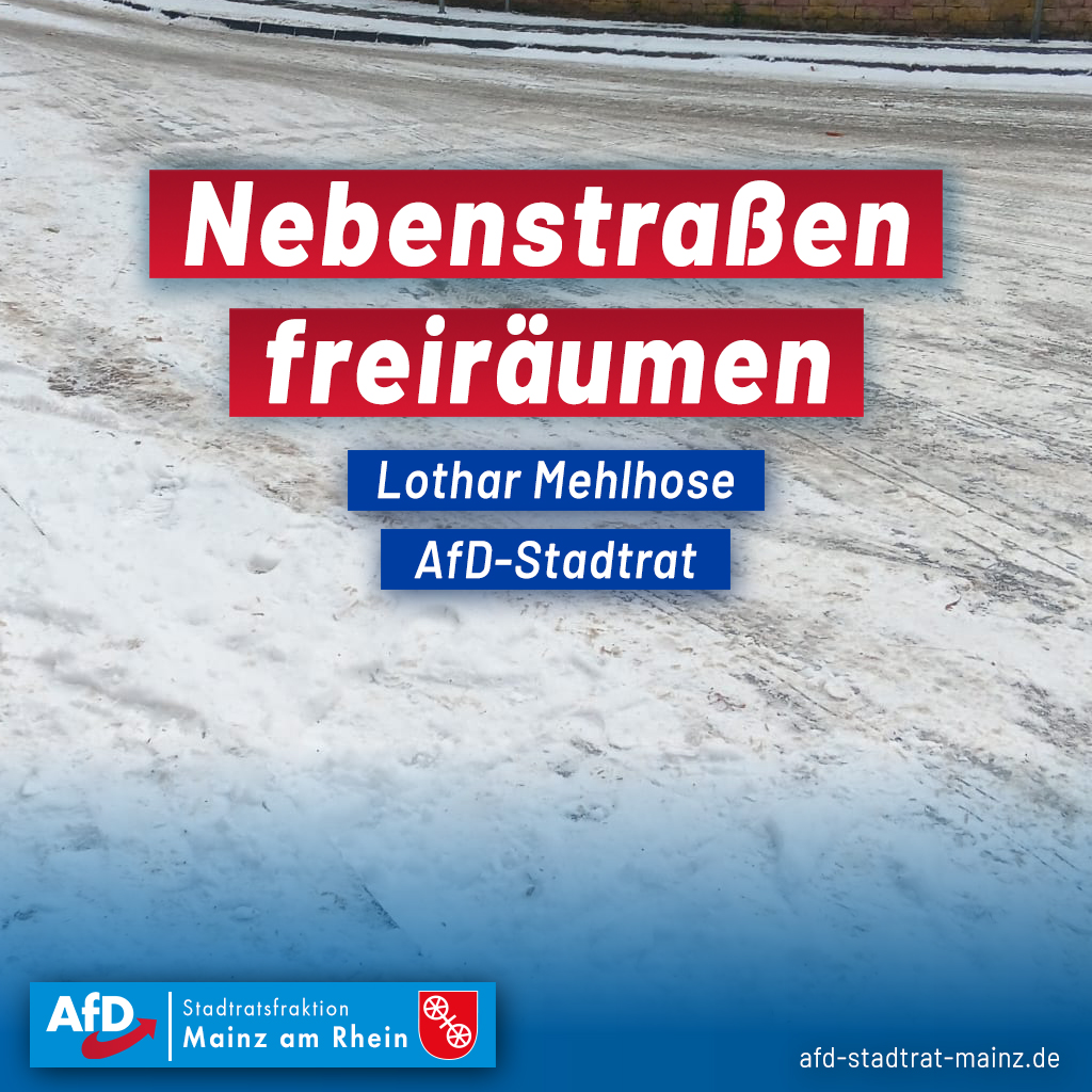- Rutschgefahr durch Glätte: Nebenstraßen freiräumen!Der Mainzer AfD-Stadtrat Lothar Mehlhose kritisiert den Umstand, dass Nebenstraßen durch die Stadt nur in Ausnahmefällen von Eis und Schnee… Rutschgefahr durch Glätte: Nebenstraßen freiräumen! weiterlesen