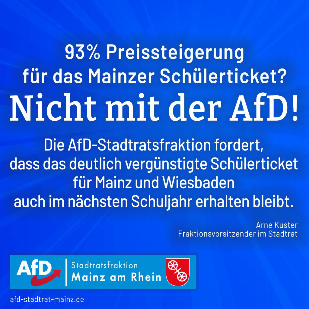 - Für den Erhalt des 365 Euro-Tickets in Mainz!93 Prozent Preissteigerung für das Mainzer Schülerticket? Nicht mit der AfD! Die AfD-Stadtratsfraktion fordert, dass das deutlich vergünstigte Schülerticket („365… Für den Erhalt des 365 Euro-Tickets in Mainz! weiterlesen
